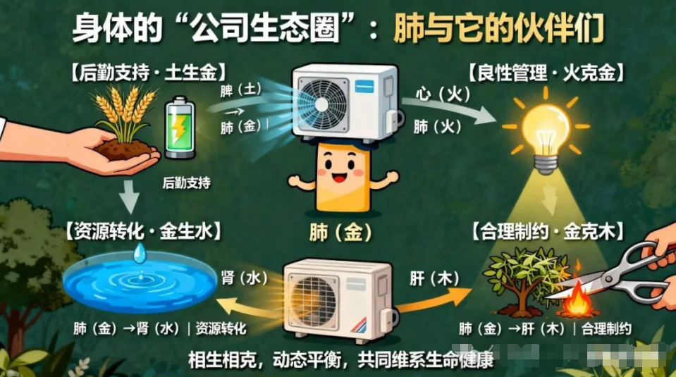 在我们身体的“公司”里,肺这个“空调部”不是孤立的,它和其他核心部门构成了一个完美的公司生态圈。这个生态圈的本质,就是 “五行相生相克” 的智慧。