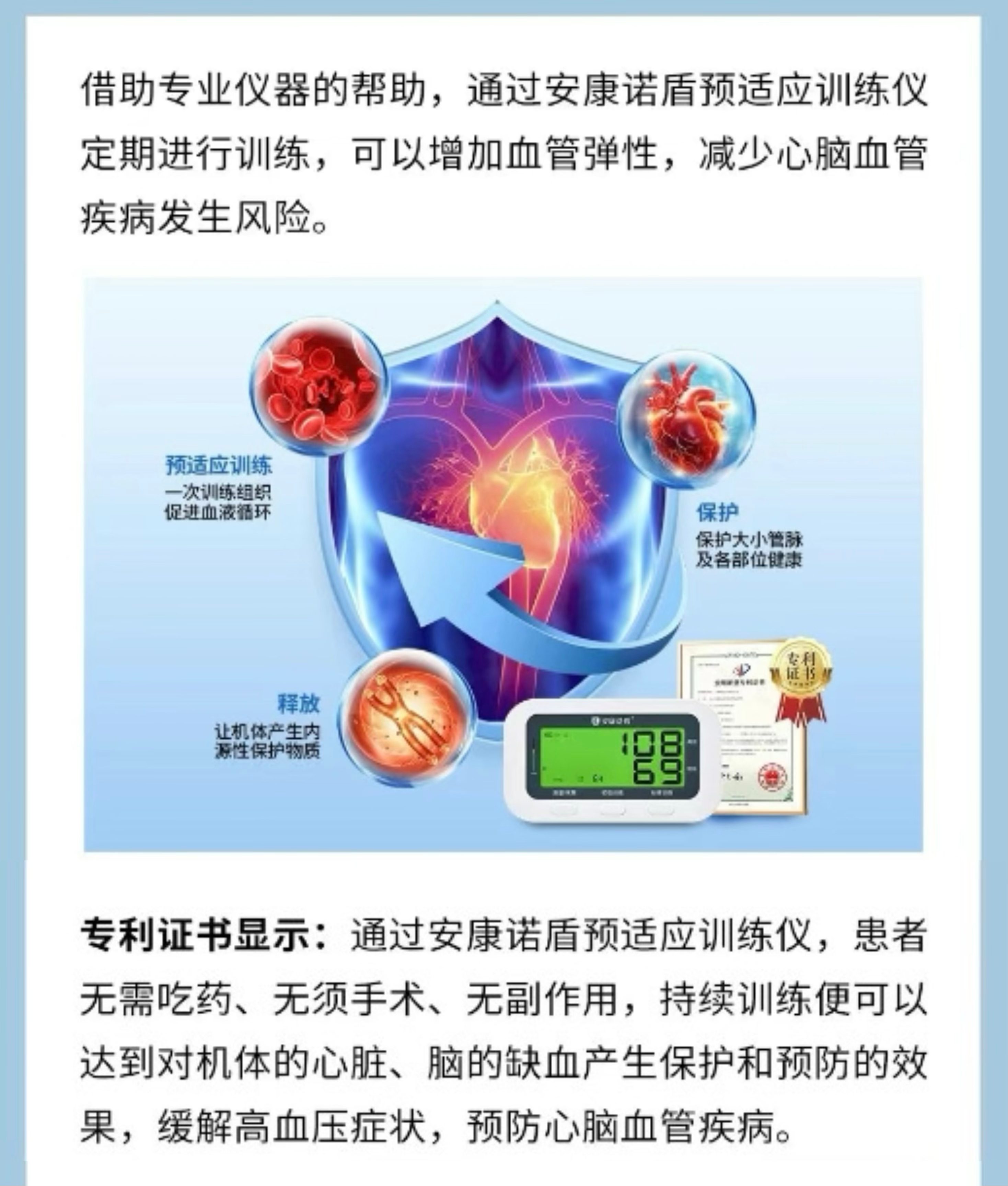 缺血预适应训练能够激发人体产生内源性保护物质,如腺苷、缓激肽、一氧化氮等,这些物质具有扩张血管、增加血流、调节血压的作用。通过反复训练,这些保护物质的作用得以累积,从而有助于降低血压水平。