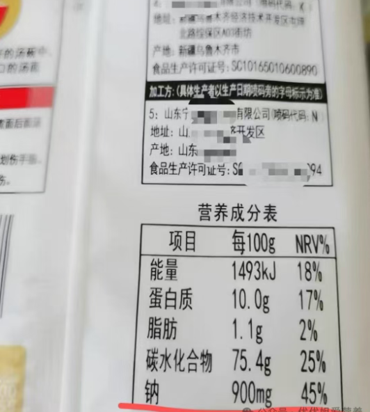 如以上的挂面,每100克含有钠900mg,营养素参考值(NRV)达到了45%,也是高钠食物。