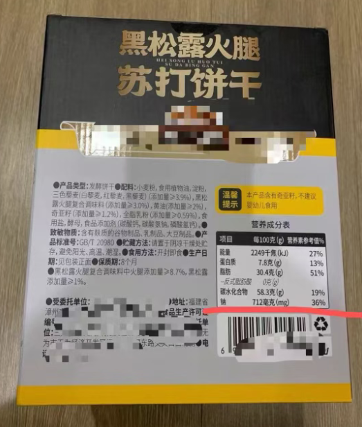 例如上图,100g苏打饼干钠约712mg,营养素参考值NRV是36%,属于妥妥的高钠食品。