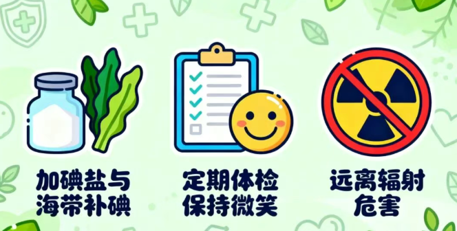 - 碘摄入别极端:碘是激素生产的必需原料,但过量或不足都不行。缺碘就吃加碘盐、多吃海产品;碘过量就少碰高碘食物(比如海带别天天吃)。