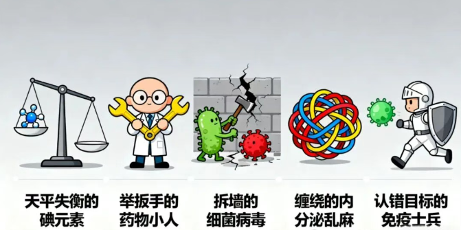 免疫系统“认错人”:免疫系统本来是保护身体的,结果它犯了糊涂,把甲状腺当成“敌人”攻击,导致甲状腺激素的合成和释放出问题。