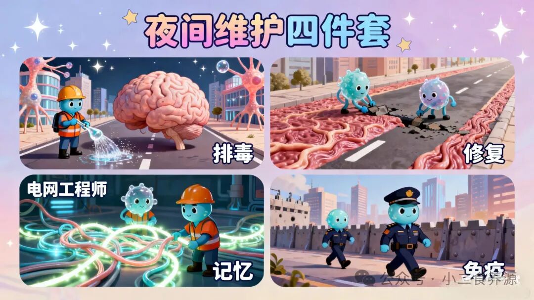 而夜幕降临:当您闭上双眼进入梦乡…… 才是这座城市最忙碌的时刻!睡眠,就是身体城市不可或缺的“夜间维护黄金窗口期”。城市的“夜间施工队”会倾巢而出,进行一场争分夺秒的深度维护: