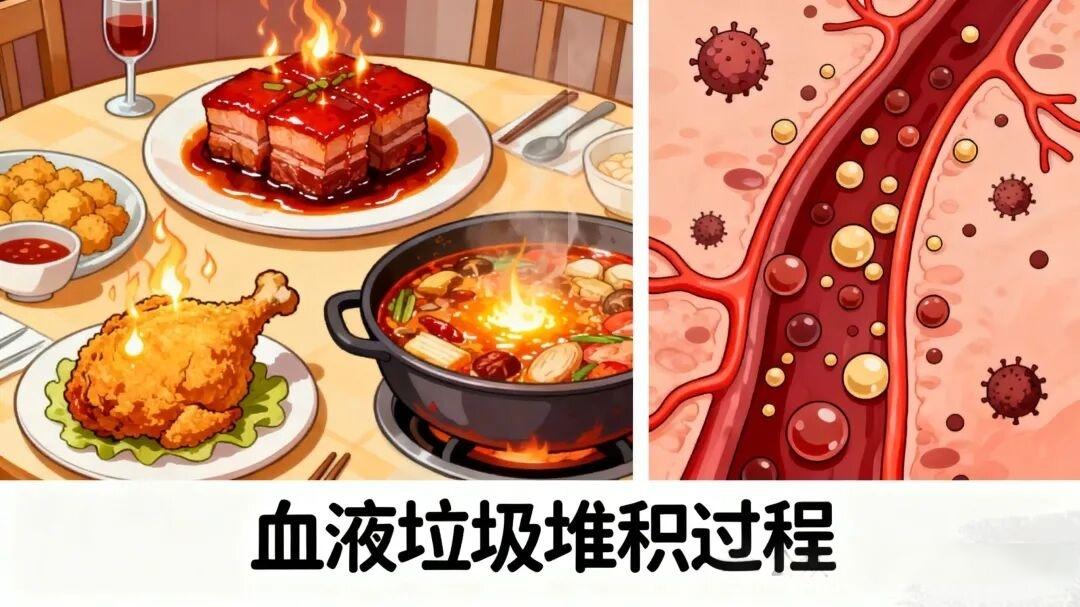 你顿顿胡吃海喝,贪凉喝冰饮、顿顿重油盐、偏爱油炸甜腻,这些不健康的饮食和习惯,就像天天给身体灌“劣质汽油”。时间一长,毒素、脂肪、代谢垃圾全堆在血液里,让血液变得又稠又脏。