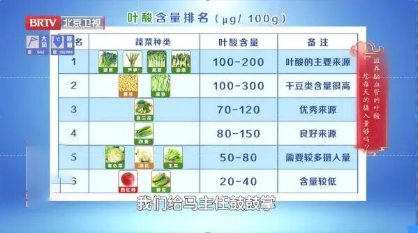 ①菠菜、莴苣、芦笋、油菜:叶酸含量在100-200(μg/100g),是叶酸的主要来源。